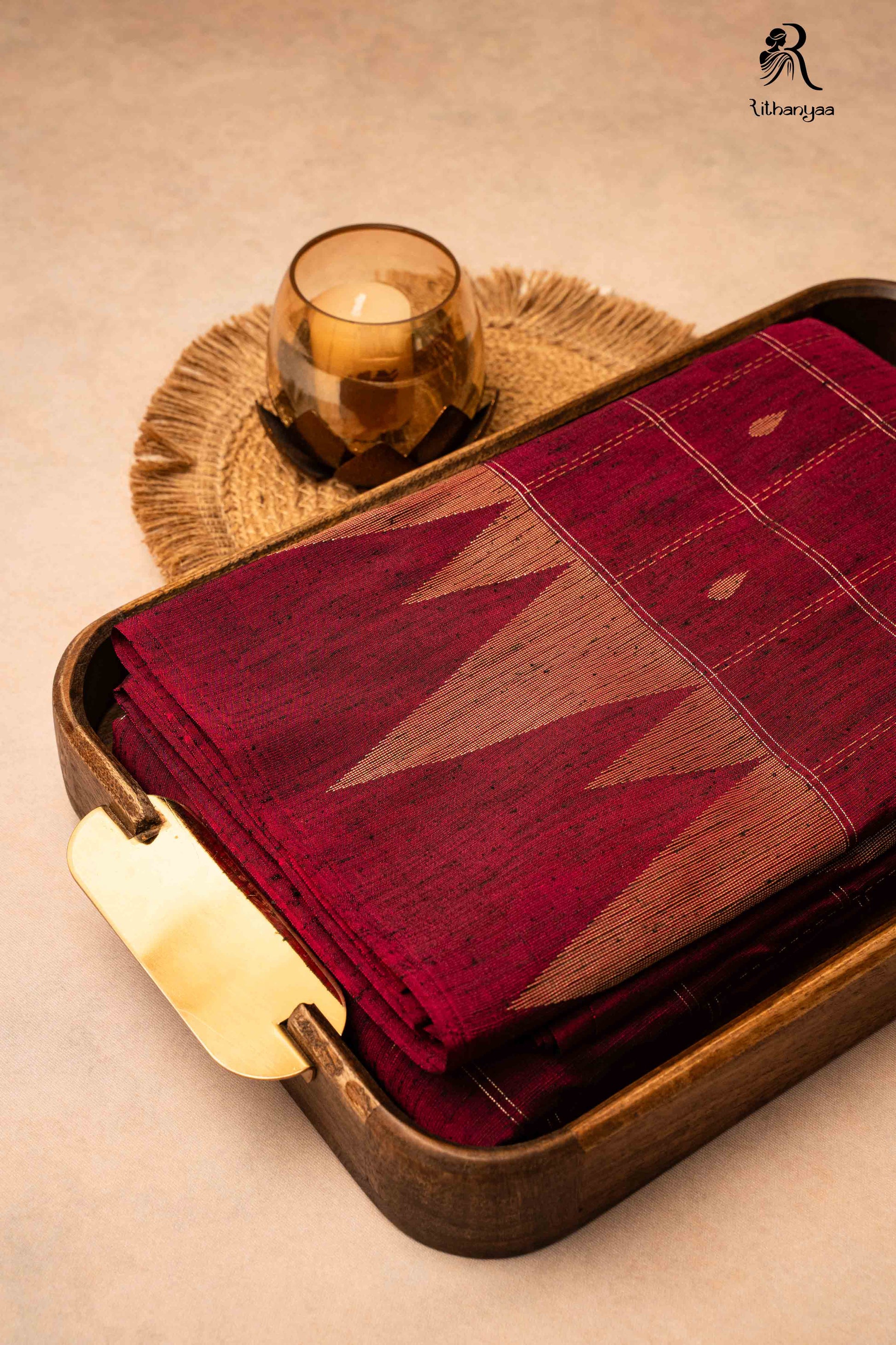 Kavira Maroon - Chettinad Silk showcases the rich heritage of Chettinad craftsmanship through luxurious silk fabric dyed in a deep maroon hue. This exquisite textile combines traditional weaving techniques with premium silk, offering a refined texture and vibrant color that enhances any garment or decor. Ideal for those who appreciate authentic artistry and timeless elegance, this fabric brings a touch of South Indian culture to your collection with unmatched quality and sophistication.