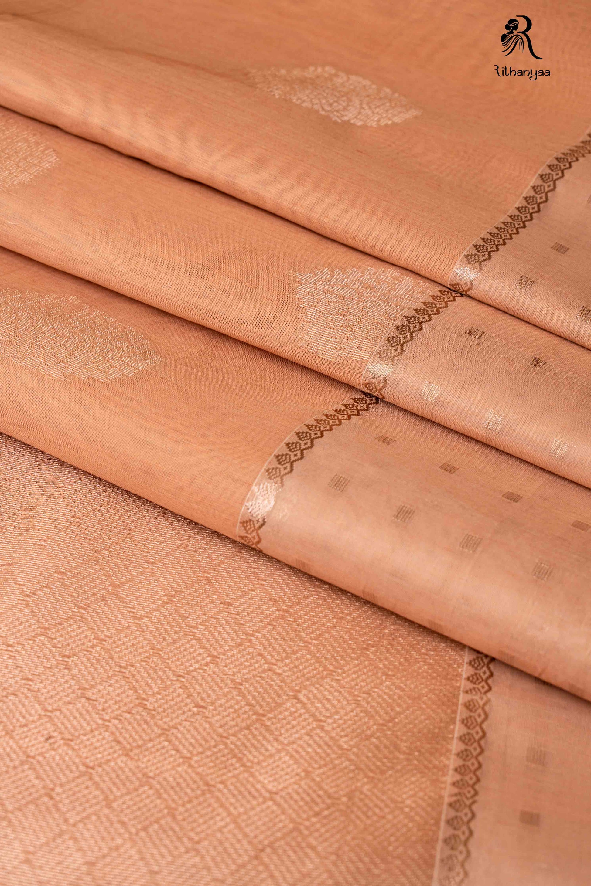 Subtle yet sublime – Varnikaa is an ode to those who embrace elegance in stillness. This soft cotton saree, woven in a charming dusty rose hue, is adorned with delicate self-checked buttas and finished with a narrow jacquard border, adding just the right touch of texture.
