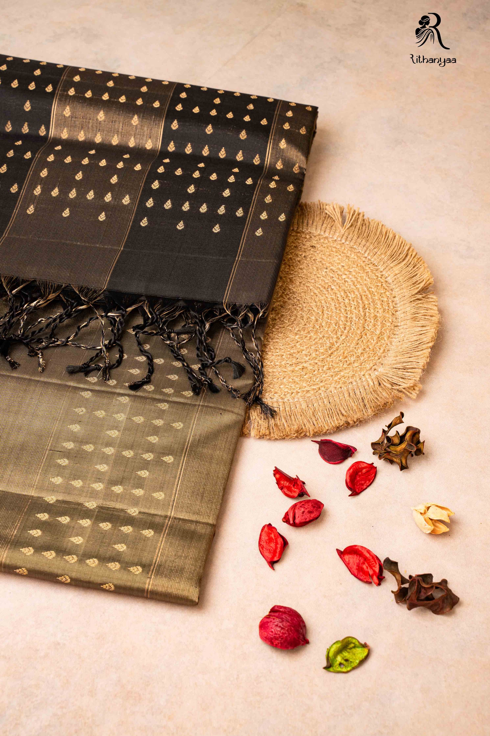Raktabha Vastra Charcoal Black & Olive Gold with Zari Motifs - Pure Soft Silk Elevate your wardrobe with this exquisite silk creation, where deep charcoal black meets warm olive gold in a harmonious dance of sophistication. Hand-crafted zari motifs shimmer across the fabric, adding layers of elegance and cultural richness. Woven from pure, soft silk, this piece drapes beautifully while maintaining its luxurious texture, making it ideal for both traditional occasions and contemporary styling. The interplay of dark and golden tones creates a timeless aesthetic that transcends seasons, ensuring this investment piece remains a cherished staple in your collection.