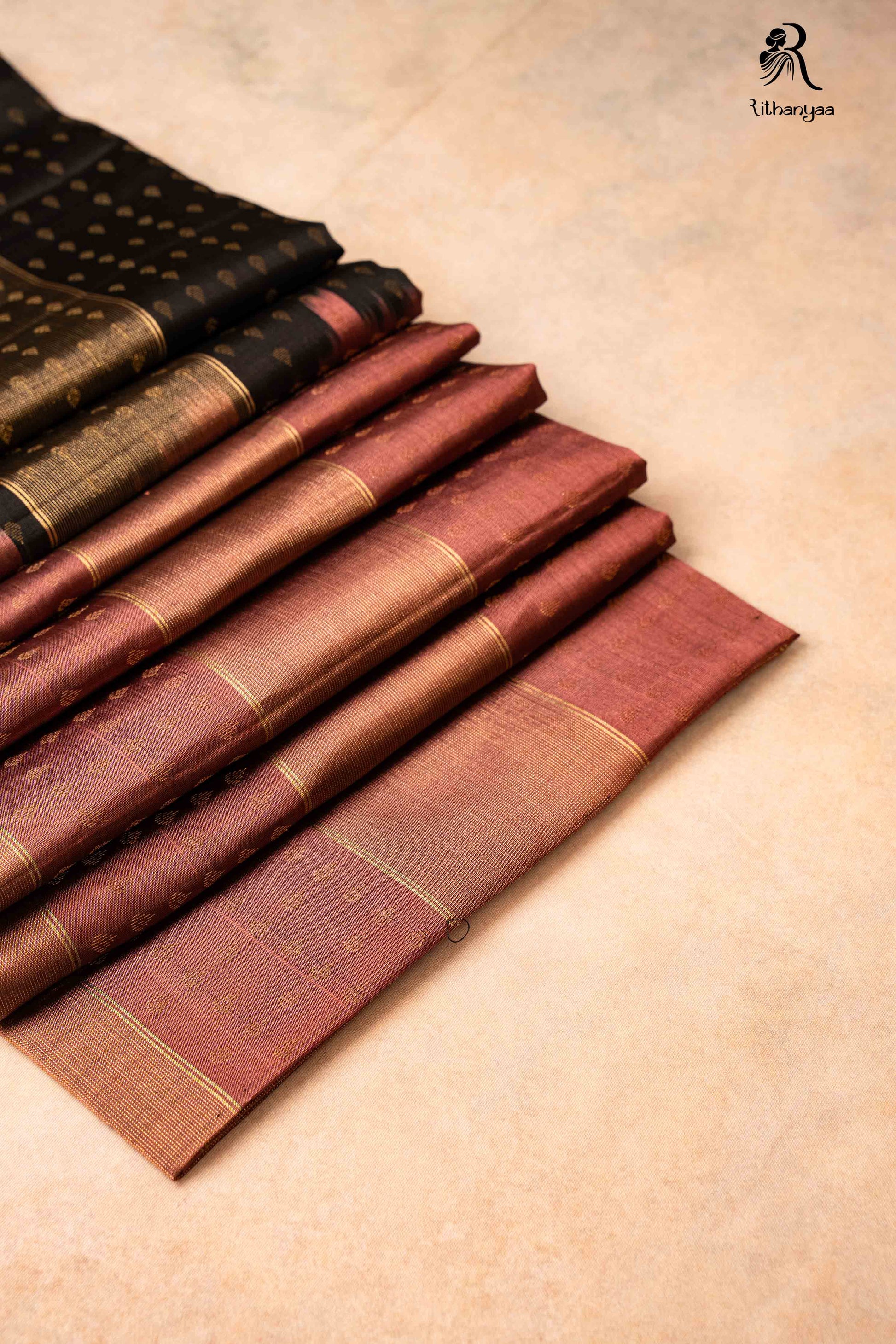 Where Timeless Elegance Meets Artisanal Craftsmanship Draped in the sophistication of deep black and dusty mauve, this pure soft silk saree embodies the essence of refined Indian textile heritage. Delicate gold zari buttas dance across the fabric, creating an interplay of light and shadow that transforms with every movement. Crafted from premium silk that feels like a whisper against the skin, Raktabha Vastra is designed for those who understand that true luxury lies in understated opulence. Perfect for celebrations, formal gatherings, or moments when you wish to make an unforgettable impression through the language of fabric and tradition.