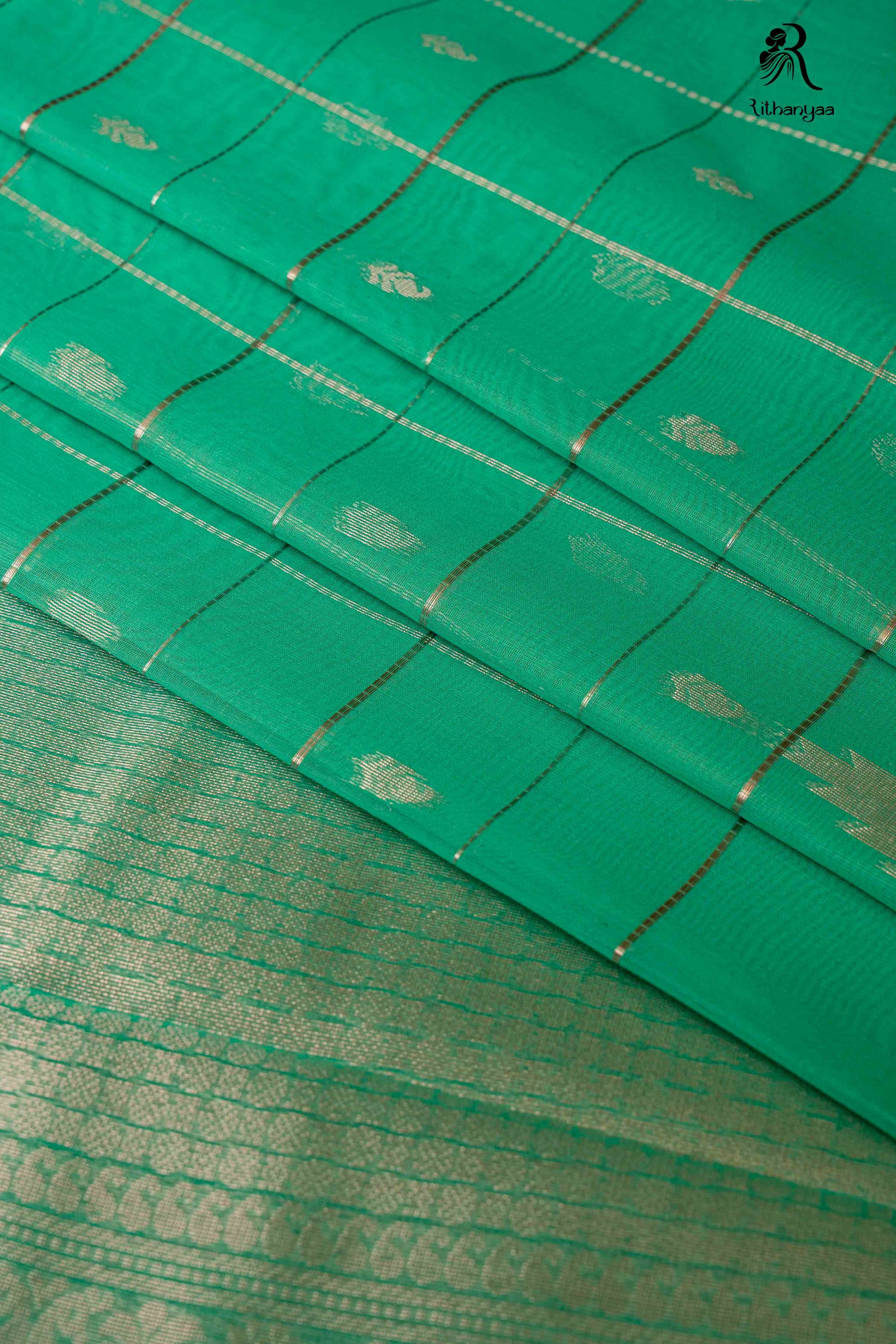 Celebrate the spirit of tradition with Chandrika, an elegant Parrot Leaf Green soft sico saree from Rithanyaa Silk and Sarees. Featuring golden zari checks and classic woven motifs, this saree reflects the vibrance of nature wrapped in graceful drapery.