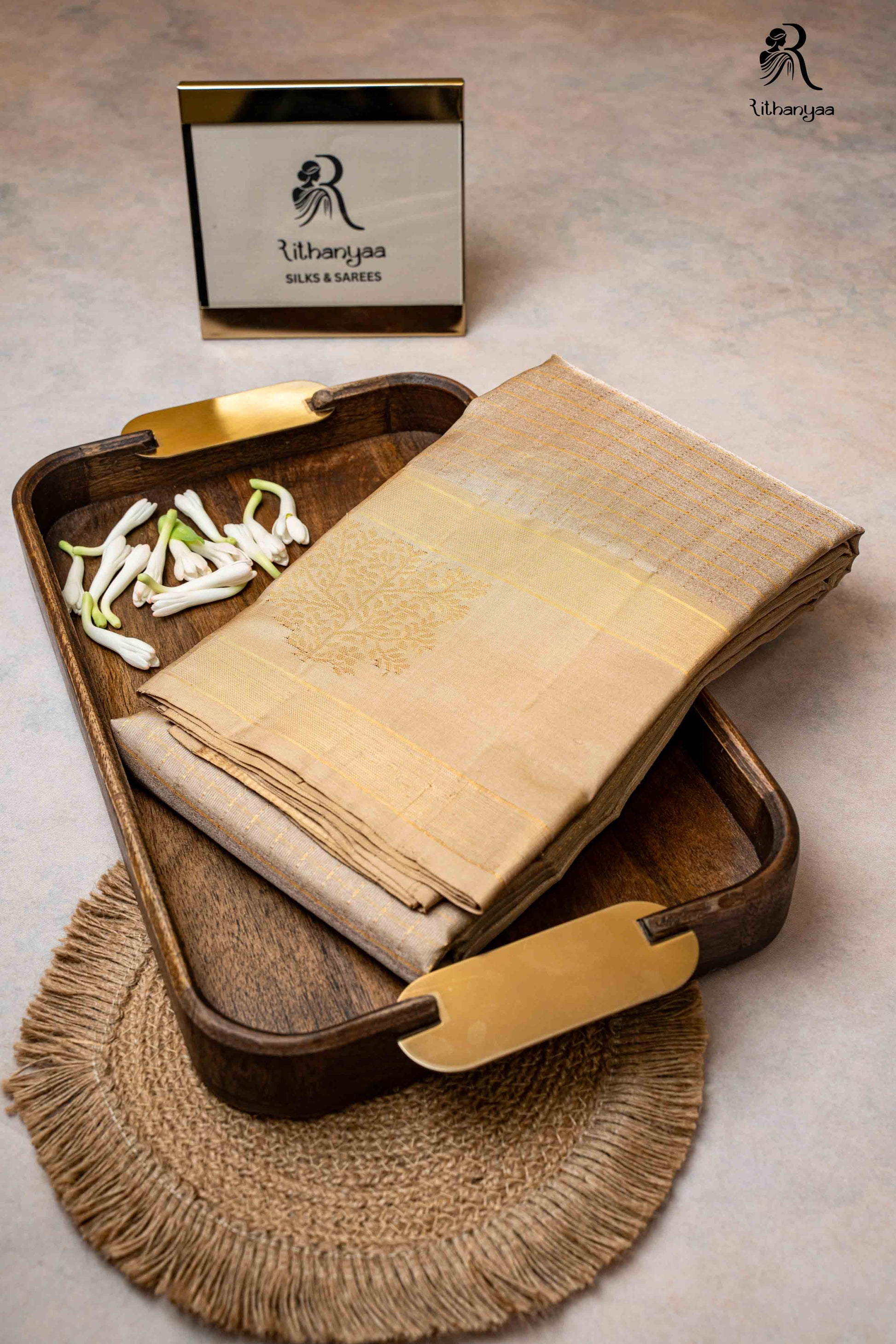 Experience the elegance of Vaarnika Champagne Gold, crafted from pure soft silk. This luxurious fabric offers a smooth, lightweight feel with a subtle sheen, perfect for sophisticated attire. Its rich champagne gold hue adds timeless charm, making it ideal for special occasions and refined everyday wear. Elevate your wardrobe with the unmatched quality and comfort of this exquisite silk.